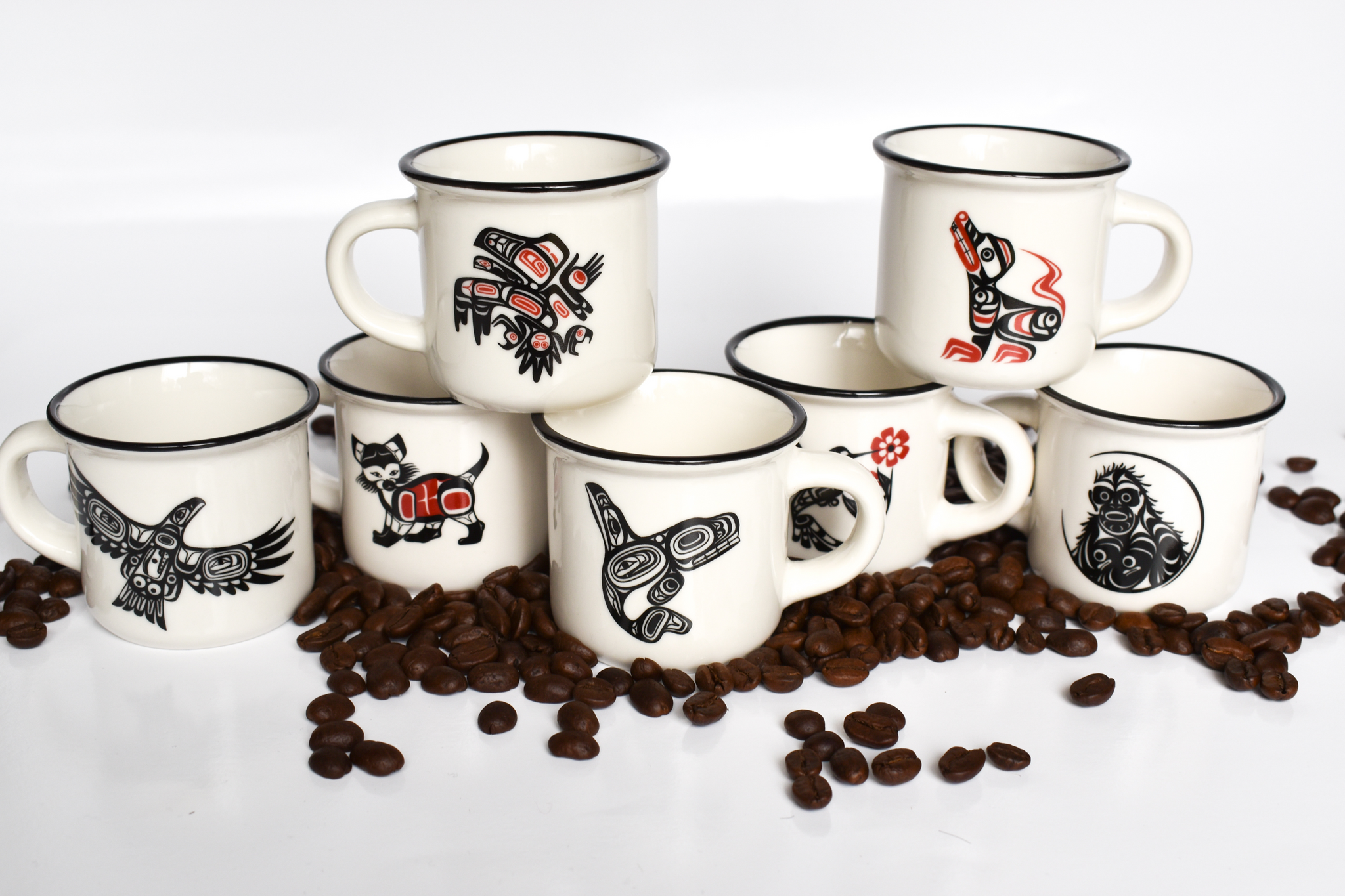 These 3 ounce ceramic mugs are perfect for a single or double shot of espresso. Coast Salish artists, Corey Bulpitt, Eric Parnell, Francis Dick and Francis Horne Sr. have contributed their art to enhance this collection of unique gifts for the coffee connoisseur. Microwave and dishwasher safe!
