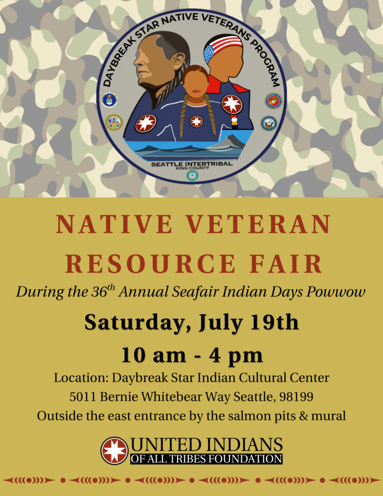 Native Veterans and community members! 🦅 We’re excited to host a Native Veteran Resource Fair during the 36th Annual Seafair Indian Days Powwow.